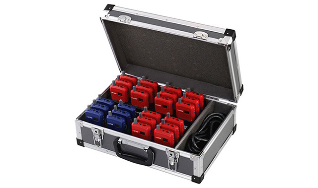 Set completo di n.2 trasmettitori 40ch con microfono lavalier, n.22 ricevitori 40ch, con auricolare, n.1 valigia di ricarica da 24 slot, n.24 collarini, n.48 batterie ricaricabili.
